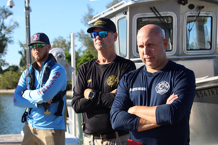 Manatee County Beach Patrol Division Ltd. David Snyder, Longboat Key Fire Rescue Training Captain John Elwood and Firefighter Paramedic Andre Hoefer listen in to a safety briefing before heading out to a morning of marine rescue training on Coquina Beach.
