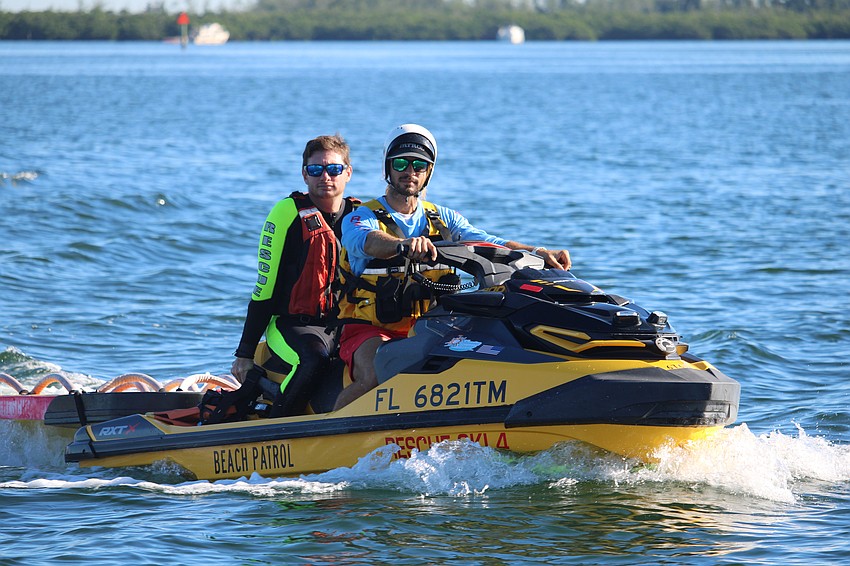 Lieutenant Jose Garcia Santos and lifeguard EMT Jack Bratcher taught Longboat Key Fire Rescue responders about jet ski-based rescues on Sept. 24 on Coquina Beach. Assisting them from the shore were Lts. Michael Patterson and JC Rapier.