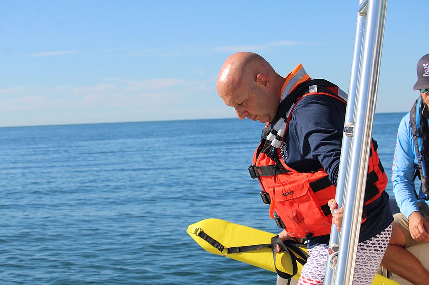 Longboat Key Fire Rescue Firefighter Paramedic Andre Hoefer prepares for a dive during a marine training with Manatee County Beach Patrol Division experts.