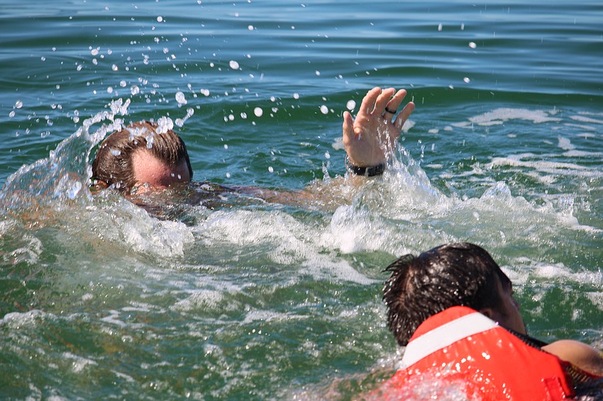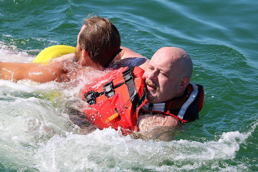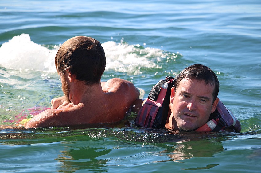 Longboat Key Fire Rescue Firefighter Paramedic Trey Bowlin practices rescuing lifeguard Cliff Talbott, who put on a convincing performance as a swimmer in distress.