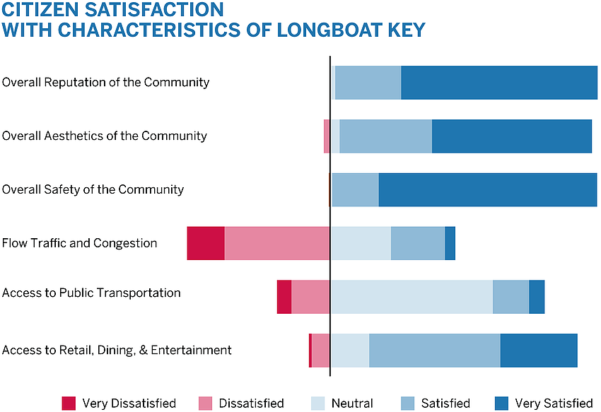 The safety, overall reputation and aesthetics of Longboat Key also got sterling reviews. Responses showed that 81% of residents were very satisfied with the overall safety of the community, with only 0.1% who said they were very unsatisfied. Asked about the overall reputation of Longboat Key, 73% were very satisfied and 25% were satisfied.