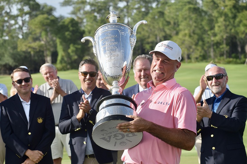 The Alfred S. Bourne Trophy is heavy — very heavy. At 36 pounds and 42 inches tall, it ranks among the largest awarded in professional golf. Stewart Cink, as the winner of the 86th Senior PGA Championship, earned the right to lift it. He jokingly struggled to do so, at first, after graciously accepting the hardware from PGA of America Secretary Eric Eshleman.