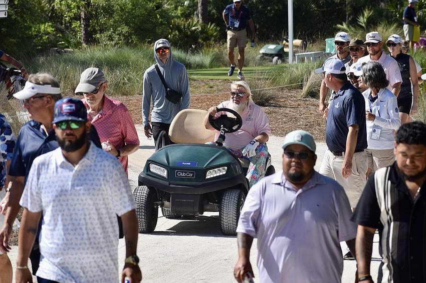 John Daly is a singular personality in pro golf. His outrageous pants, white beard and matching white mullet make for a one-of-a-kind appearance. This second-round moment by the ninth-hole tee sums up the aura about him. Not only does he flash a grin while weaving through a sea of spectators, but if you look closely at his left hand, you'll notice he's holding a cigarette and box of Marlboro Reds.