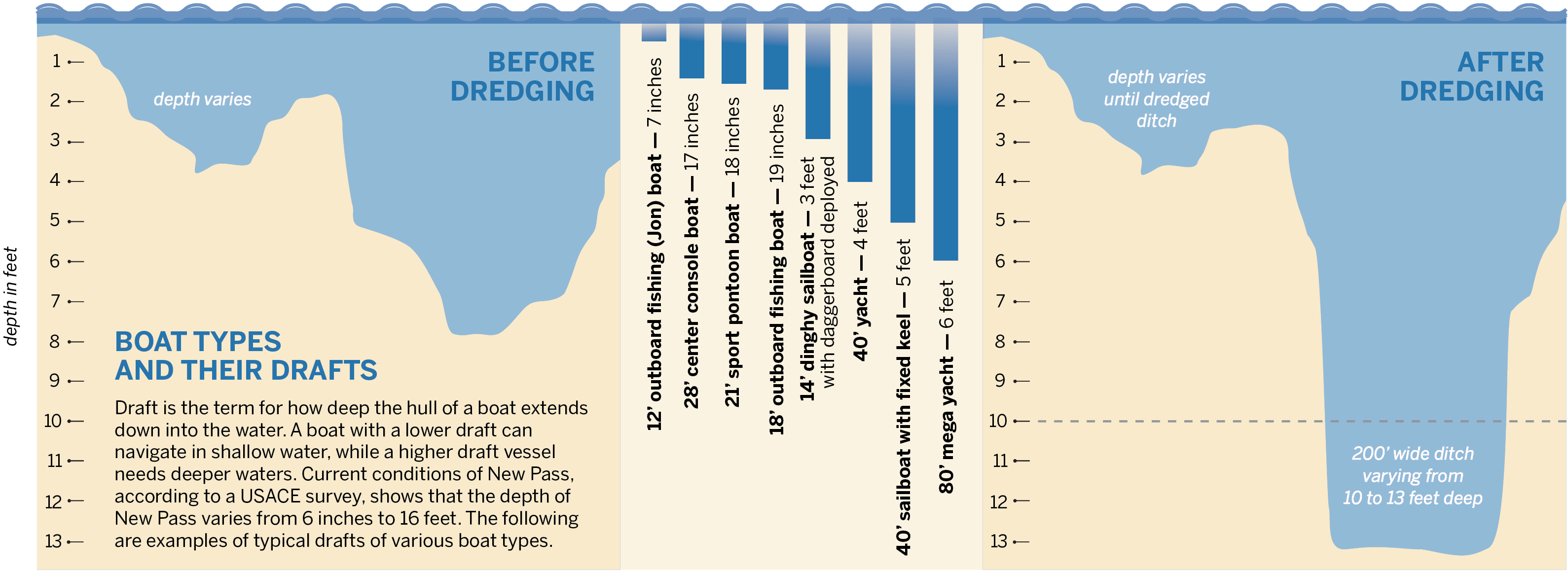 According to National Oceanic and Atmospheric Administration charts and U.S. Army Corps of Engineers dredging plans, the depth of New Pass varies from 6 inches to 16 feet. And with the sea floor shifting from storm to storm, weaving through the pass is done so at boaters’ risk.