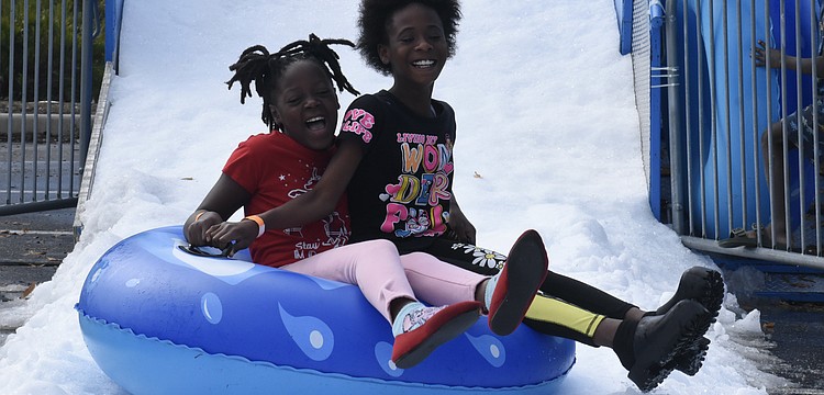 Ava Glauser, 3, and her sister, Vallen Glauser, 5, enjoy the Snow Day at First Sarasota Church on Jan. 12. During the event, these Florida kids enjoyed a special treat with 17 tons of crushed ice, snow slides and food trucks offering pizza and shaved ice.