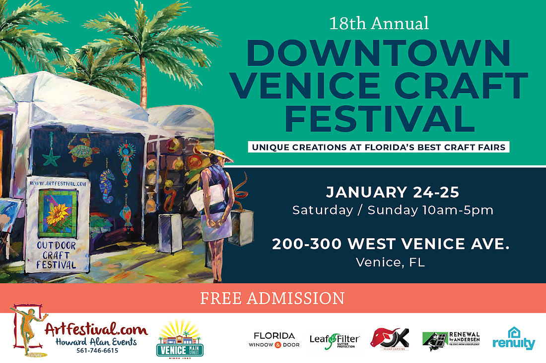 Description: Join us in Downtown Venice to browse and purchase a wide variety of ceramics, jewelry, stained glass, metal works and much more. Our event will be set up along West Venice Avenue, one of Venice’s historic downtown streets. In addition to the incredible crafts, our Green Market offers live flora, freshly popped kettle corn, gourmet spices, and sauces. Come meet and visit with some of the nation’s best crafters, as you stroll along downtown Venice.
