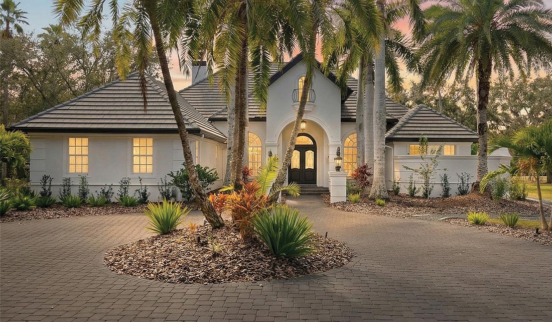 Maison du Lac, a stunning home nestled in Lakewood Ranch Country Club, boasts an unparalleled view and TT Heritage ads the vision. Originally built by Anchor Builders, this home has unique roadside columns with the numbers 6959 and Maison du Lac. They created a teardrop driveway leading to a side 3-car garage and a circular driveway to the main entrance.