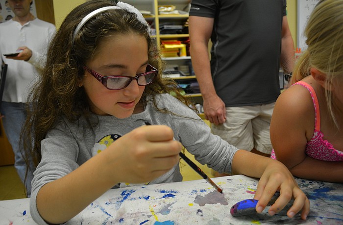 Sixth grader Stella Schechter holds up a finished craft for David Stone.