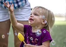 Stone Flood, 5, takes a turn slipping down the inflatable water slide at Sand Cay’s Easter Egg Hunt.