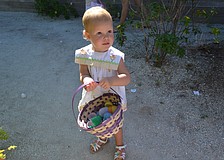 Natalie Merino shades her face from the sun, but not her empty basket; she’s ready to hunt eggs, she said.
