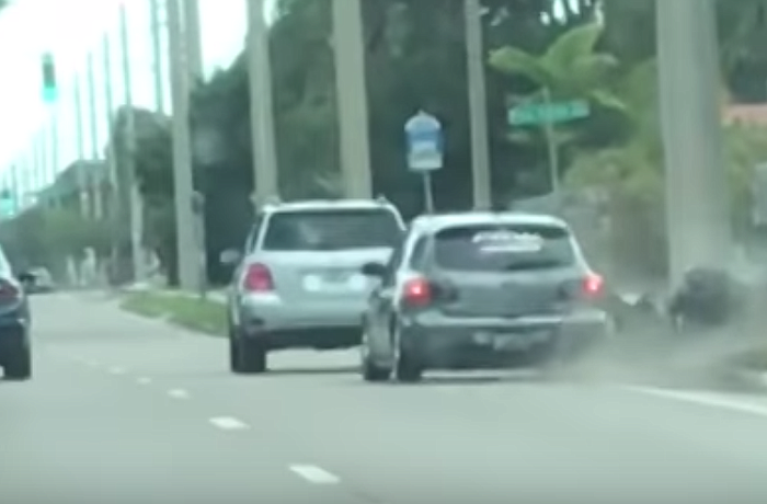 A video taken by a witness depicts a gray Mazda 3 striking a motorcyclist and causing him to crash on the side of the road.