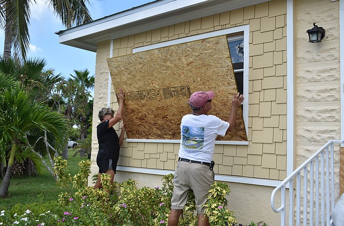 Mike Tringali drills boards over the windows of Zanne Gordon's Lido Key home Friday afternoon.
