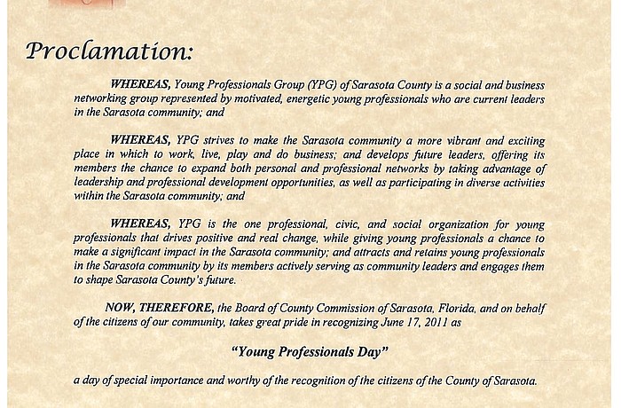 The city of Sarasota, Sarasota County and State of Florida Rep. Ray Pilon have proclaimed June 17 'Young Professionals Day.'