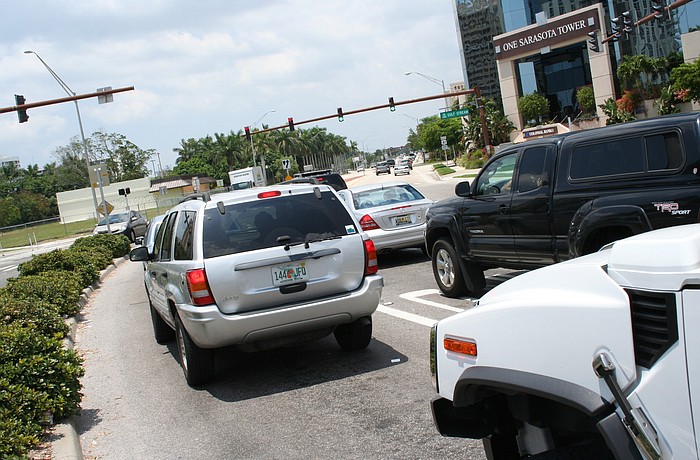A roundabout at the intersection of Ringling Boulevard and Pineapple Avenue opened this morning. A second roundabout at Palm Avenue is still under construction.
