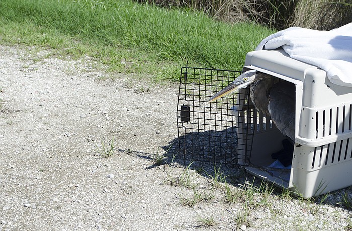 A great blue heron was rescued May 22, after getting wrapped in fishing line and hanging upside down from a power line for hours.