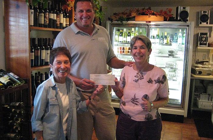 Susan Landau and Madelyn Spoll of the Garden Club get presented a check from Hal Christensen with Harry's Continental Kitchens for the wine tasting fundraiser.