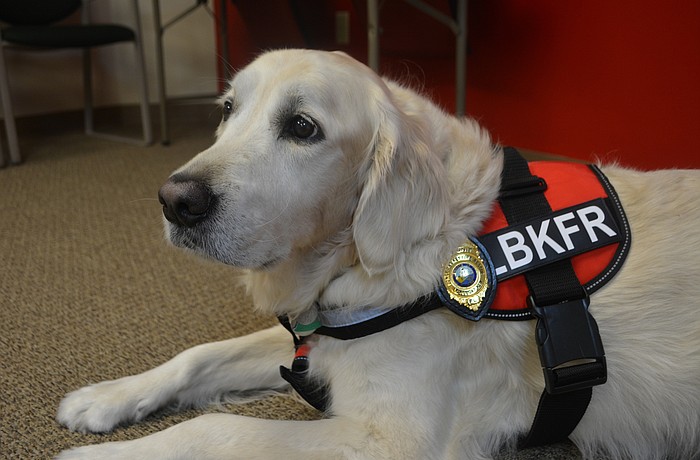 The golden retriever aids first responders in feeling comfortable and opening up to discuss topics from PTSD to anxiety