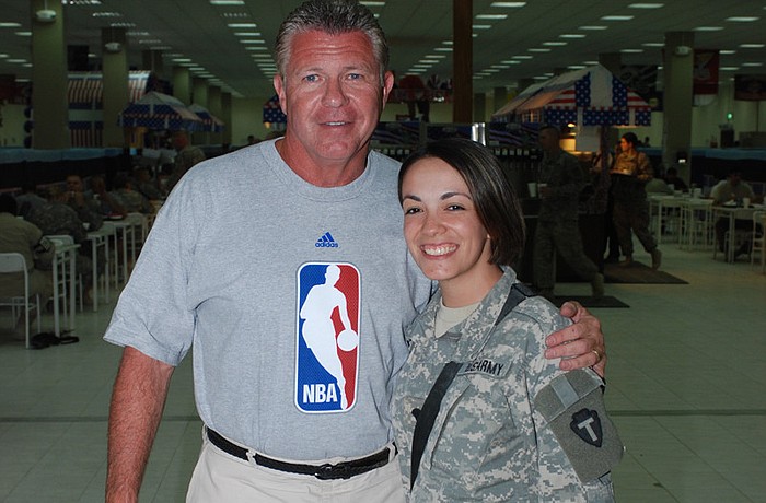 Former undercover agent and NBA referee Bob Delaney will kick off a campaign to collect new sports team T-shirts and other logo clothing items for the troops on Saturday.