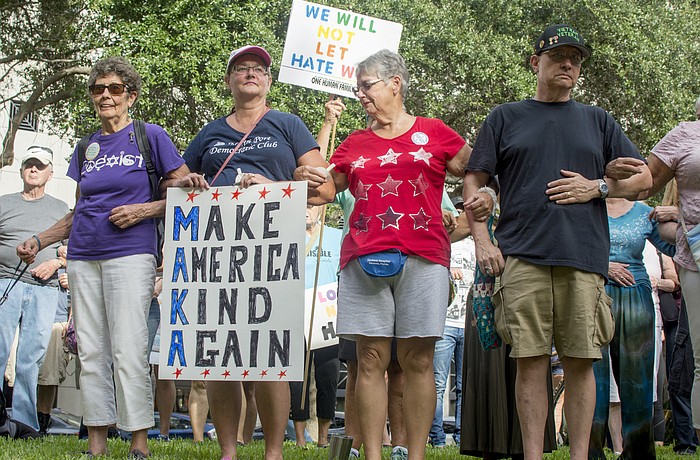 After a rally drawing thousands of white supremacists to Charlottesville, Va., about 100 people gathered in downtown Sarasota to show their opposition to hate.